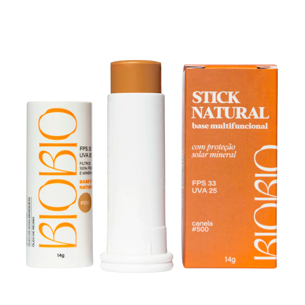 Base Stick natural BioBio cosméticos com FPS 33 e UVA 25 e ativos de cuidados com a pele, disponíveis em 8 tons.