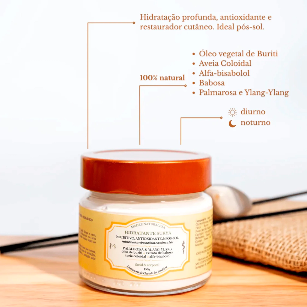 Óleo vegetal de Buriti: planta nativa do Cerrado brasileiro que é utilizada há milhares de anos para tratar a pele exposta ao sol. Este óleo nutre todas as camadas da derme e acalma a pele. É uma fonte natural de betacaroteno (vitamina A) e de tocoferóis (vitamina E), agentes antioxidantes.