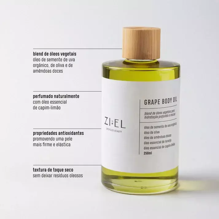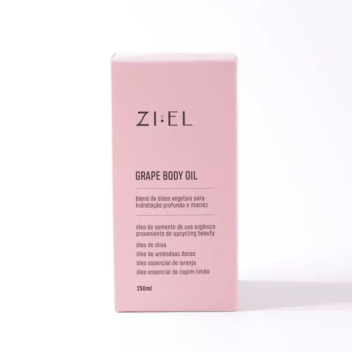 O óleo corporal de uva da Ziel é um cosmético formulado com um blend de óleos vegetais , composto por óleo de semente de uva orgânico, óleo de oliva e óleo de amêndoas doces, que promovem hidratação profunda e maciez da pele.