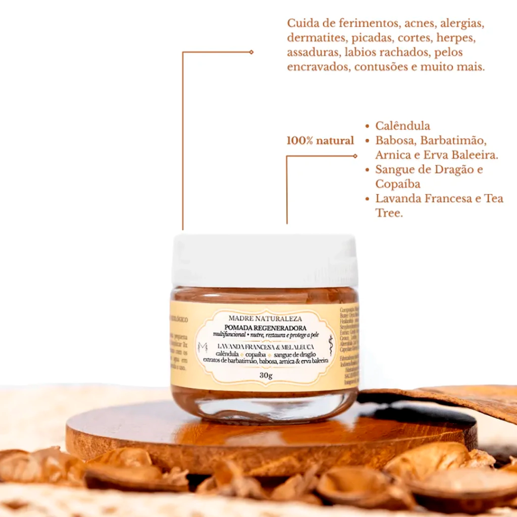 Fórmula com potencial medicinal e curativo imenso, composta pelos melhores ativos naturais antissépticos, anti-inflamatórios, cicatrizantes, bactericidas, fungicidas, regeneradores e clareadores da pele. Nutre e hidrata profundamente, além de evitar a formação de manchas escuras no local afetado.