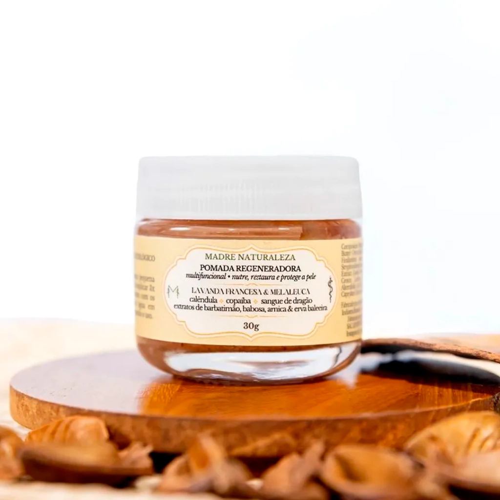 Composta por Manteiga de Manga e Manteiga de Ucuúba. Óleos vegetais de Calêndula e Girassol. Extratos de Babosa, Barbatimão, Arnica e Erva Baleeira. Resinas de Sangue de Dragão e Copaíba. E óleos essenciais de Lavanda Francesa e Tea Tree.