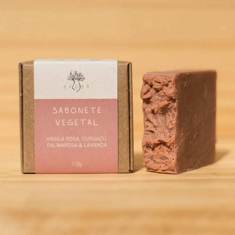 Azeite de Oliva, Óleo de Palma, Água desmineralizada, Óleo de Palmiste, Hidróxido de Sódio, Manteiga de Cupuaçu, Argila Rosa, Óleos Essenciais de Palmarosa, Lavanda e Melaleuca, Óleo Resina Alecrim.