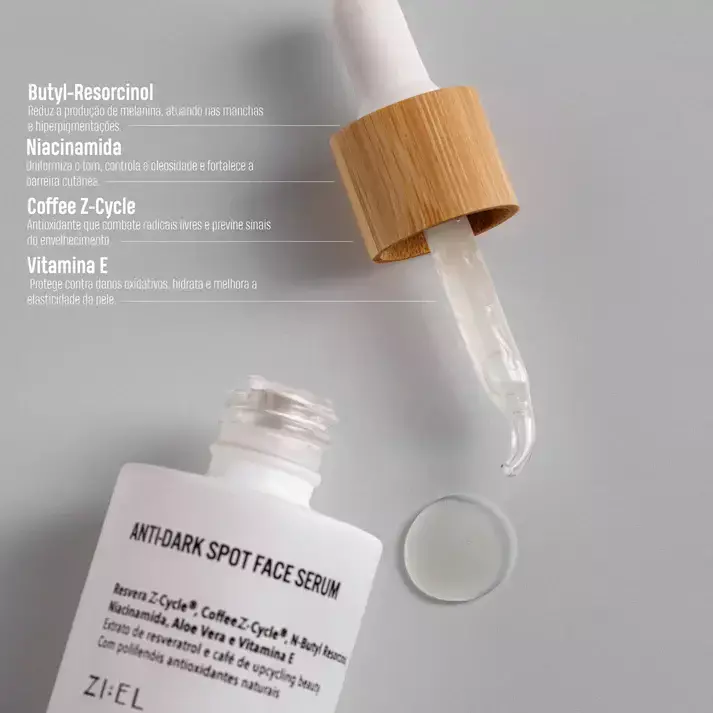 Descubra o poder do skincare inteligente para uniformizar o tom da pele e reduzir marcas escuras visíveis. O Sérum Clareador da Ziel combina ativos naturais de alta performance, como o exclusivo Resvera Z-cycle® (resveratrol nanoencapsulado) e o inovador Coffee Z-cycle®, além da eficaz niacinamida, N-Butyl-Resorcinol, Aloe Vera e Vitamina E.