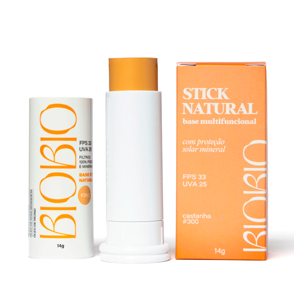 Base Stick natural BioBio cosméticos com FPS 33 e UVA 25 e ativos de cuidados com a pele, disponíveis em 8 tons.