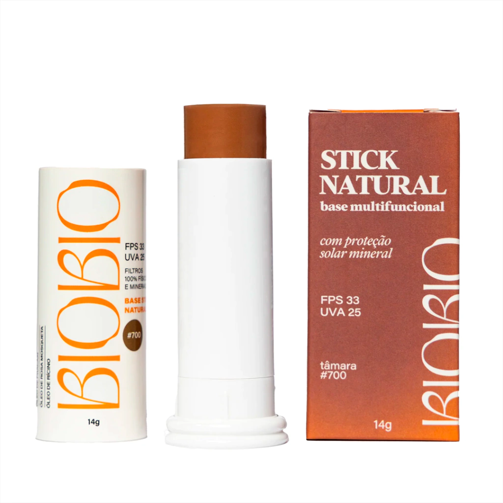 Base Stick natural BioBio cosméticos com FPS 33 e UVA 25 e ativos de cuidados com a pele, disponíveis em 8 tons.