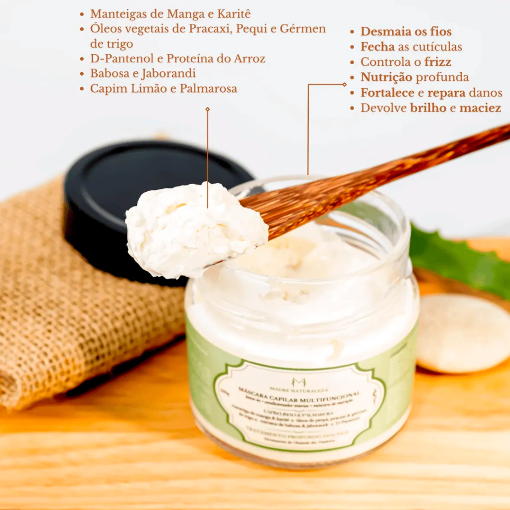 Sua composição carrega Manteiga de Manga, Manteiga de Karitê e óleos vegetais de Gérmen de Trigo, Pracaxi e Pequi. O conjunto desses agentes emolientes garantem proteção para os fios, evitando o ressecamento, além de fornecerem maciez e brilho sem deixar os cabelos pesados. É poderosa no tratamento do frizz.