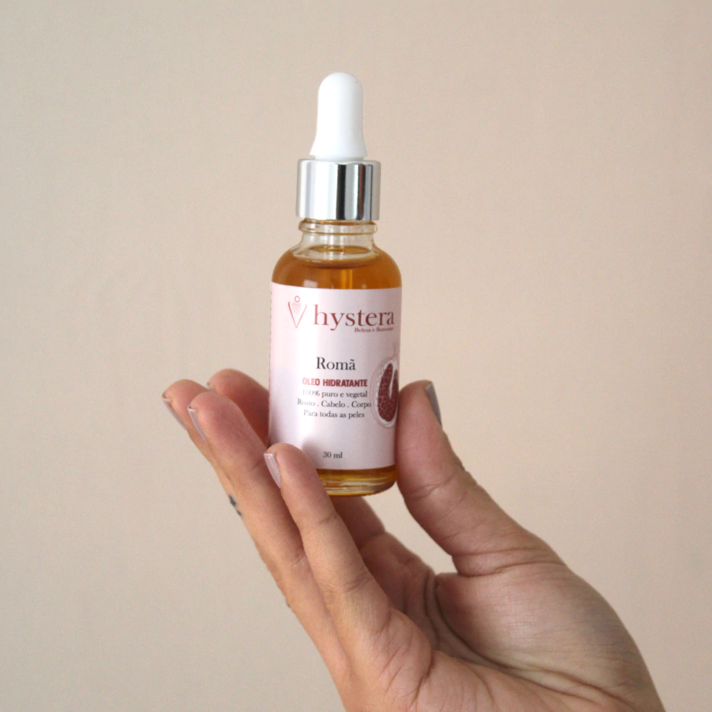 O Óleo Hidratante de Romã da Hystera é Vegano, 100% puro, prensado a frio, livre de conservantes, hipoalergênico.